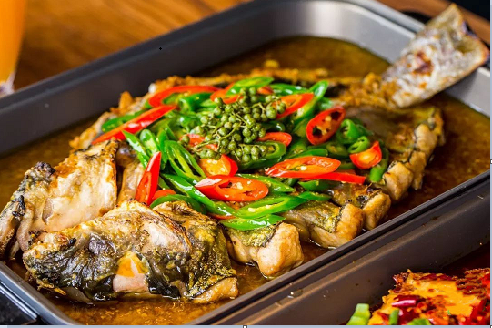 3、起鍋燒300克熟菜籽油,燒到160℃,放入50克蒜子,100克青紅椒段,50克鮮青花椒,熗出香味淋入烤魚盤內,加熱五分鐘,讓青花椒充分入味,這道菜就完成了。