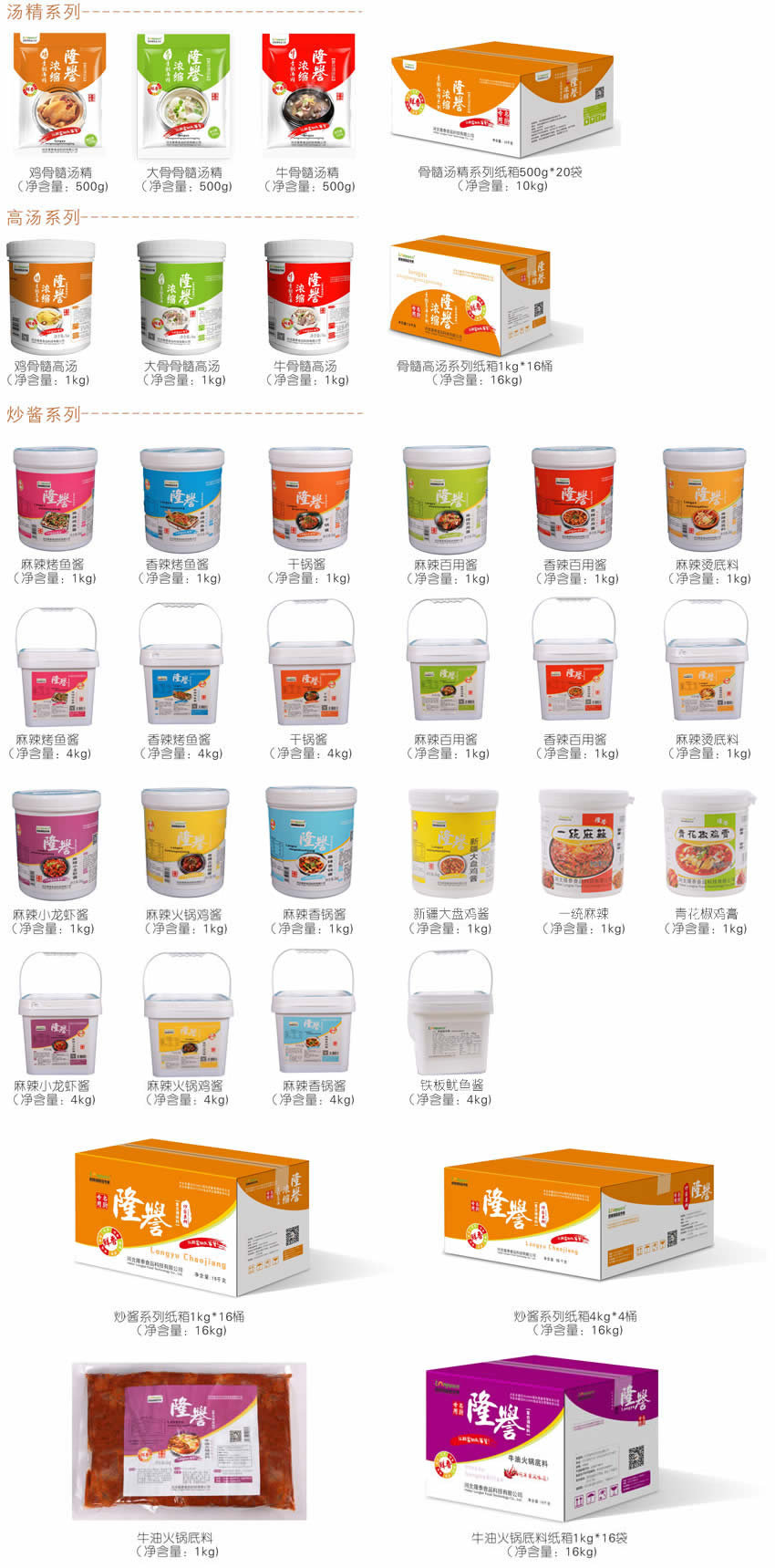 “隆譽”復合調(diào)味料系列產(chǎn)品,包括骨髓湯精系列、骨髓高湯系列、炒醬系列三大類產(chǎn)品,是傳統(tǒng)與現(xiàn)代飲食風味技術(shù)的完美結(jié)合,對飲食起到畫龍點睛、立竿見影的應用效果,品質(zhì)上乘、穩(wěn)定,使用方便、快捷,降低人力成本,提升運行效率,助推餐飲企業(yè)標準化運營,以無與倫比鮮香美味,達到讓顧客排隊等餐的生意火爆程度。